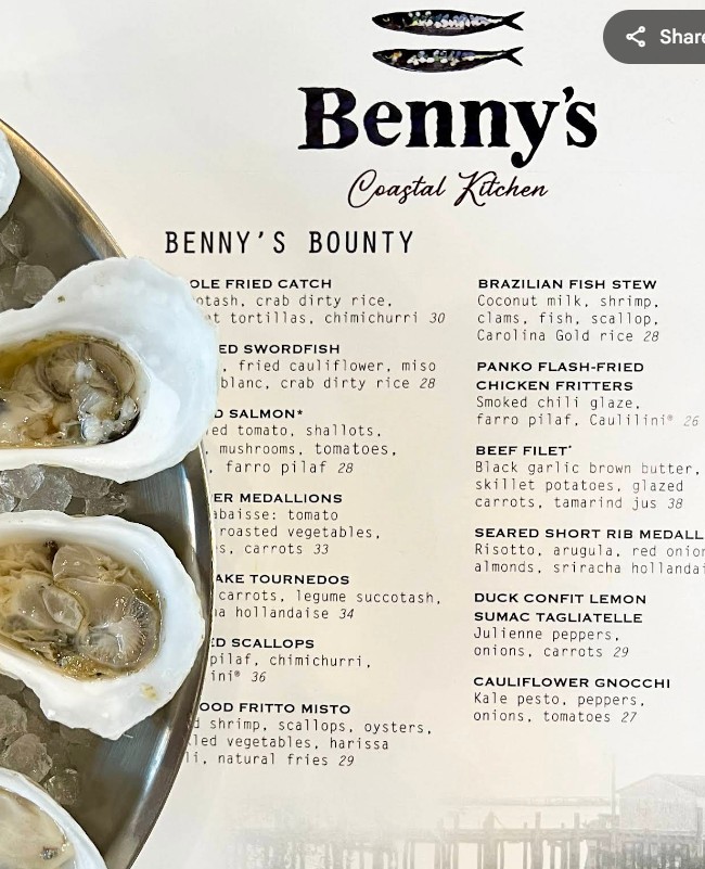e really enjoyed our visit to Benny’s Coastal Kitchen. The food was absolutely delicious, fresh, and cooked perfectly. The atmosphere is also very nice, with a relaxed and welcoming vibe that makes it a great spot to enjoy a meal. The only thing I noticed is that the servers could be a bit more attentive and friendly to match the high quality of the food and atmosphere. Other than that, everything was great!