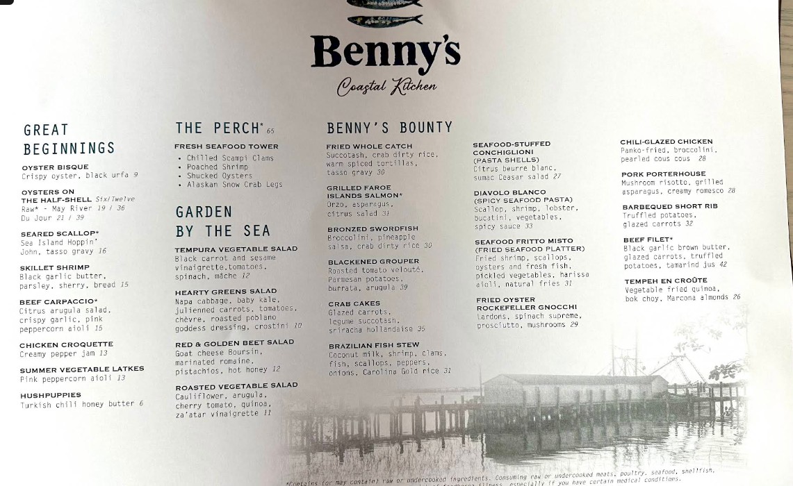 At Benny's Coastal Kitchen, we pride ourselves on offering the freshest seafood and a variety of southern-inspired dishes in a relaxed coastal setting. Located in Hilton Head Island, SC, our restaurant menu features everything from classic seafood dishes like shrimp and grits to unique chef specials. Whether you're joining us for a leisurely meal with family or grabbing a quick bite, you can expect a vibrant atmosphere and top-quality food with every visit. Come savor the flavors of the coast with us today!